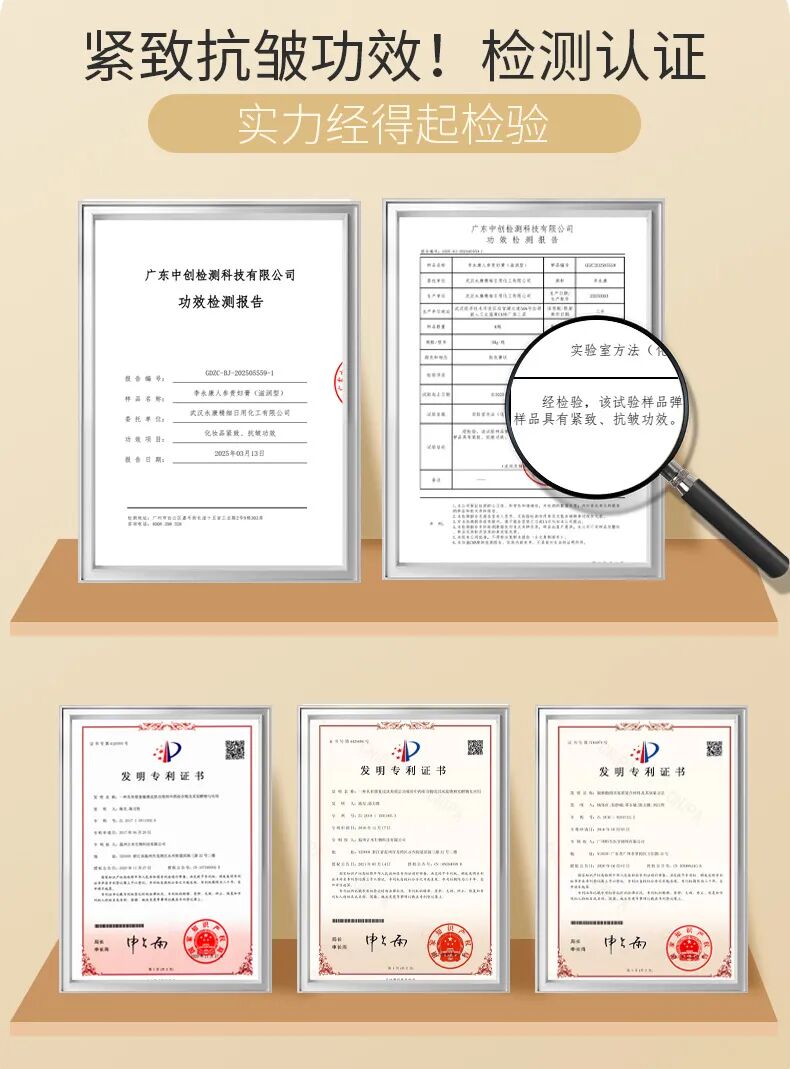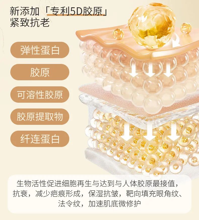 “专利5D胶原”可以靶向填充眼角纹、法令纹、抬头纹,紧致肌肤、缩小毛孔,使得皮肤变得紧绷有弹性,抑制表情肌收缩,纤连蛋白加速肌底微修护,提升肌肤自愈力。肌肤被胶原蛋白撑起来了,自然年轻有弹性。