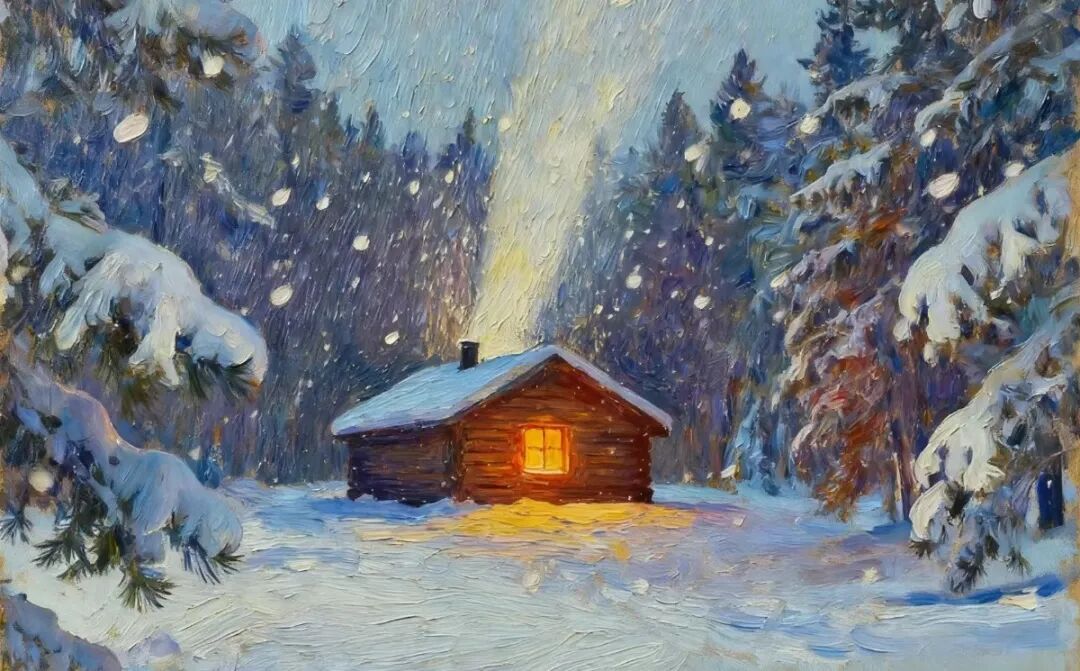 白昼时间极其短暂,回到车上时,已经从白天到了晚上,再回到房间里时,像从冬天到了夏天,篝火把房间映照得红彤彤又暖腾腾的,眼镜上像贴了一层丝毫不透光的白纸。这是我遇到过最大的雾气了,把二人世界氤氲出不真实的感觉,擦干净镜片,真实的氛围又像从夏天来到了冬天,我把小台灯放在桌子中央,和煤油灯一样昏暗,但也能缓解尴尬。因为屋外檐角也挂着一盏灯,打开后,把房子周遭映衬得黄白相间,分不清亮堂堂的到底是灯光还是雪色。我回到先前的窗口位置发呆,感觉自己像苦行僧一样看着雪世界的雪平线越积越厚,却无能为力,在等死抑或者相约白头中,就此陷入了一场白色海市蜃楼的陷阱里。看久了白色,我有些眩晕,甚至幻想出来一只熊,也许它感到了屋里的暖,或者闻到了蜂蜜面包的味道,隔着窗户往里张望,我打开房门邀请它来做客,我不觉得害怕……哪怕如此,都远比只有两个人要好。