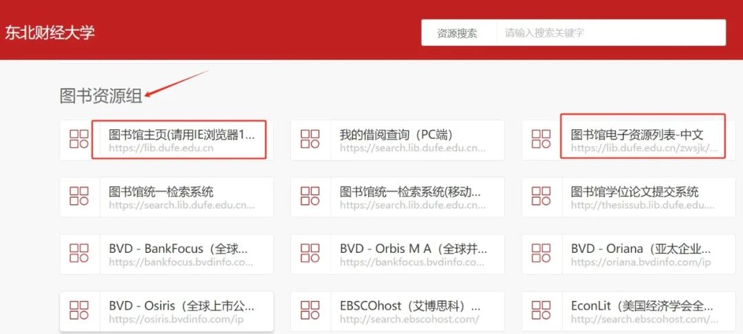 成功登录后找到“图书资源组”,点击相应链接即可通过校外访问图书馆主页及相关电子资源。