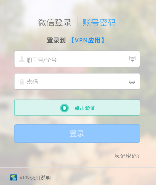 1.VPN账号为本人学号(教工为职工号),密码和学校信息门户密码一致。如遇账号类问题,请使用“东财e服务”公众号的e服务大厅菜单,通过“报修平台”联系智慧校园建设中心老师在线办理。(办理时间:周一至周五8:00至17:00)