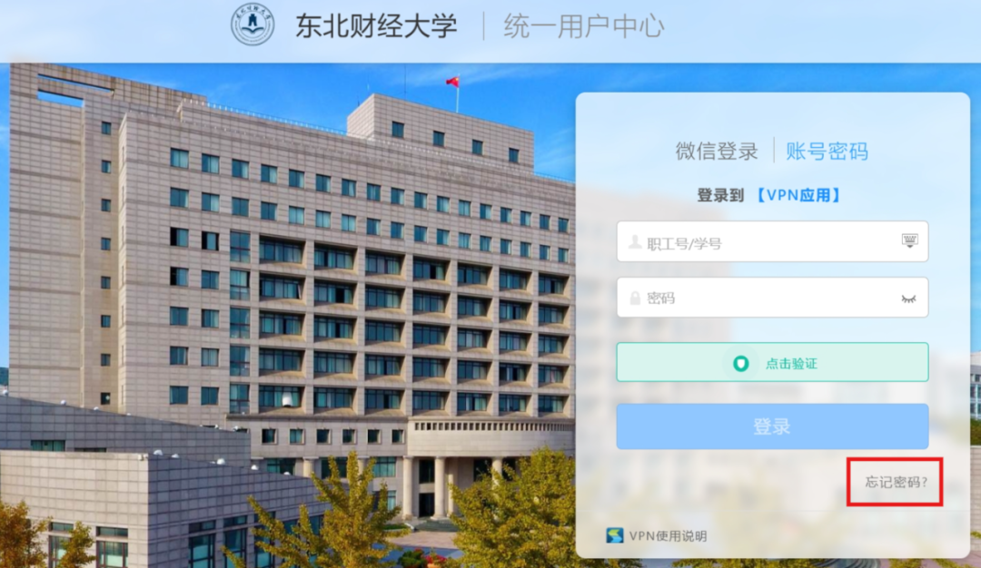 2.如忘记VPN账号密码或登录时反复提示“用户名密码错误”,请访问学校信息门户(https://sso.dufe.edu.cn/),点击“忘记密码”进行自助修改。如下图: