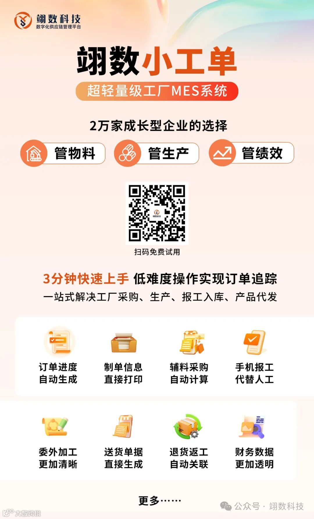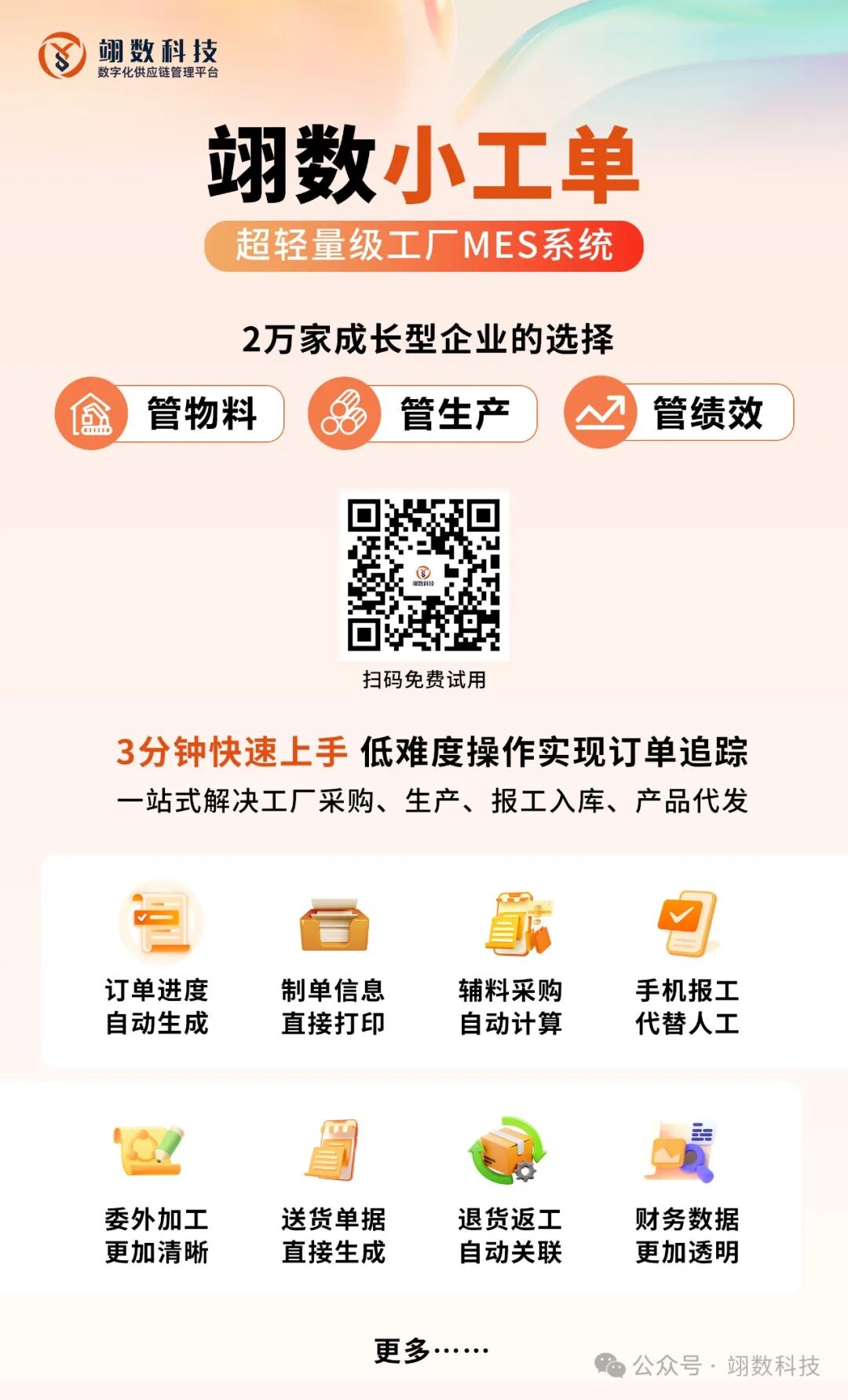 作为一款专为成长型企业设计的工厂MES系统,翊数小工单凭借其出色的性能赢得了超过2万家用户的青睐。它能够实现3分钟快速上手,支持订单追踪、库存管理、辅料采购计算等多项功能,为工厂带来前所未有的便利。