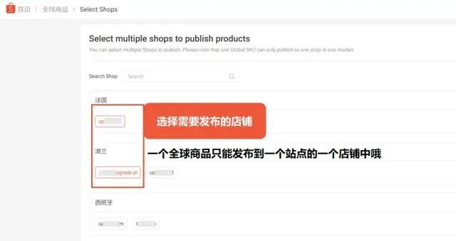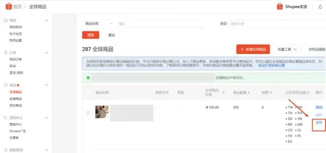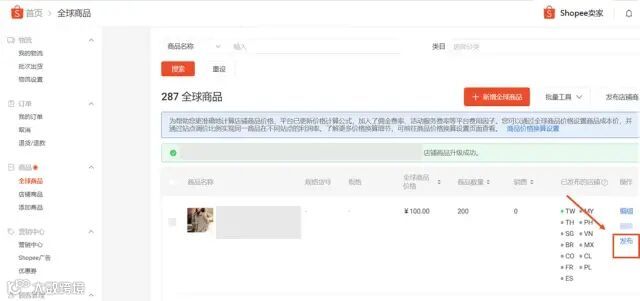 对于已经创建好的全球商品,也可以点击侧边栏的【发布】来发布到多个店铺。