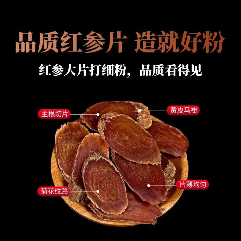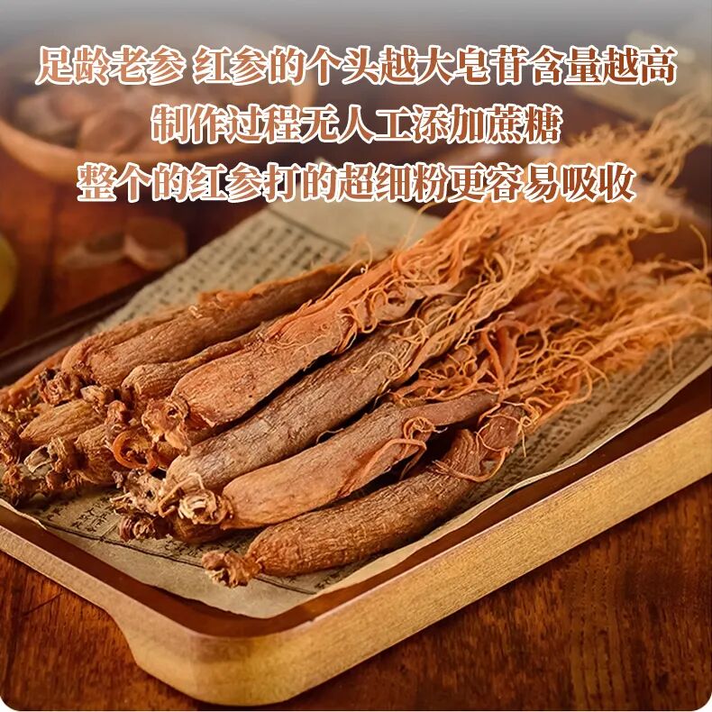 成分完整:粉末形态保留了红参的全部组成部分,包括人参皂苷、多糖、氨基酸、微量元素等,是“全食物”营养的补充方式。