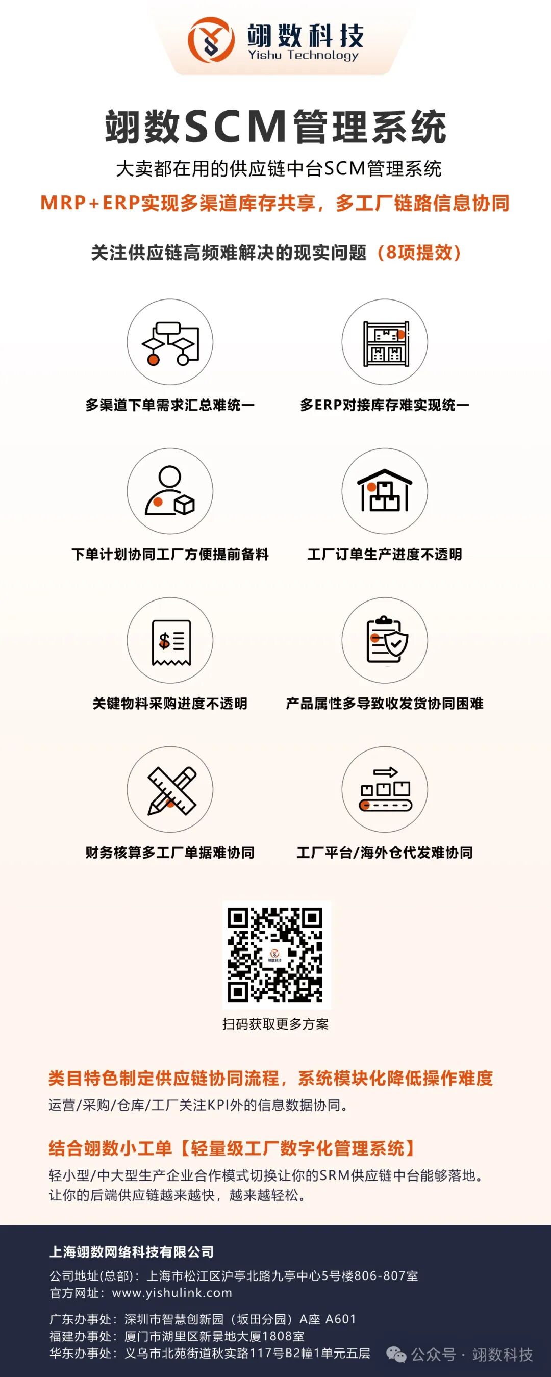 在采购管理与工艺加工成本的管控上,翊数通过智能化的采购建议,给予采购预警提醒,避免断货情况的发生。同时协同业务部门的采购计划,合理规划采购任务。系统不仅支持 1688 采购,还覆盖了传统线下采购模式,更结合翊数 SCM 实现了企业和工厂之间的协同采购。