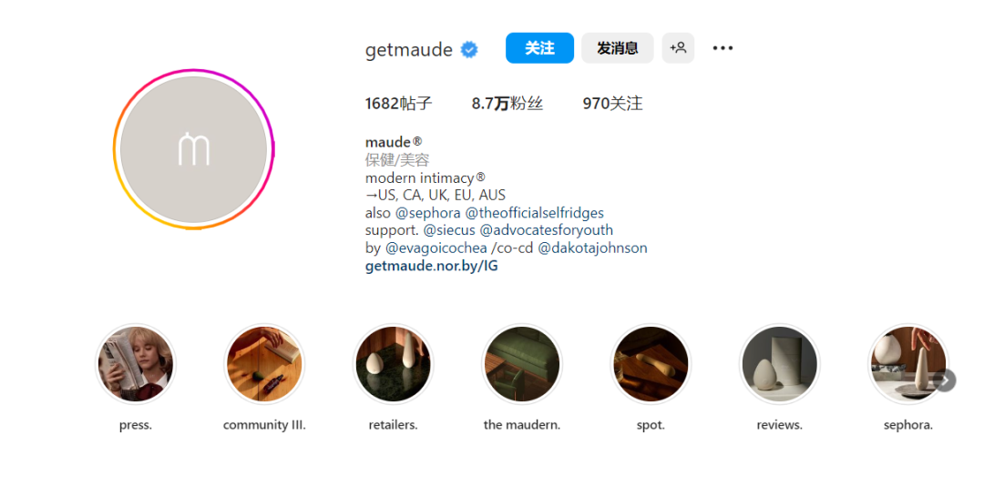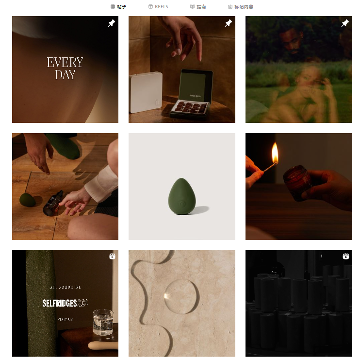 MAUDE在Instagram上有8.7万的粉丝,它在Instagram上通过展示产品的品质和设计感,创造了自己的品牌形象,主要通过创意的照片和视频内容,宣传性健康知识和价值观,展现出其独特的、与众不同的品牌形象。
