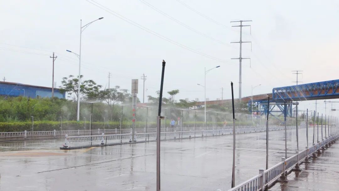 该系统采用模块化设计,共安装140个可调节喷头,通过精准控制喷射角度和覆盖范围,实现了对扬尘区域的无死角覆盖,在确保抑尘效果的同时,实现水资源的高效利用。