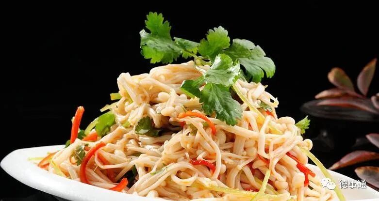 【第二步】 金针菇切去根部,洗净撕成小朵放入锅中,煮熟后捞出过凉水,沥干水份备用。(30-40秒即可)