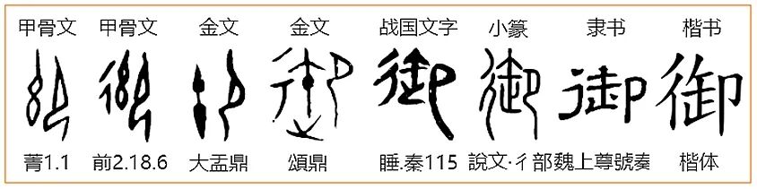 让我们先来看看“御”字的字形演变与字源演变(参见下图):