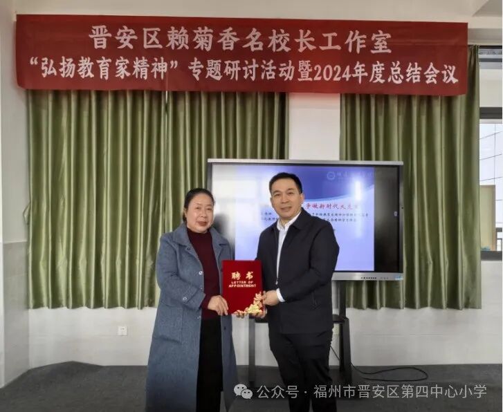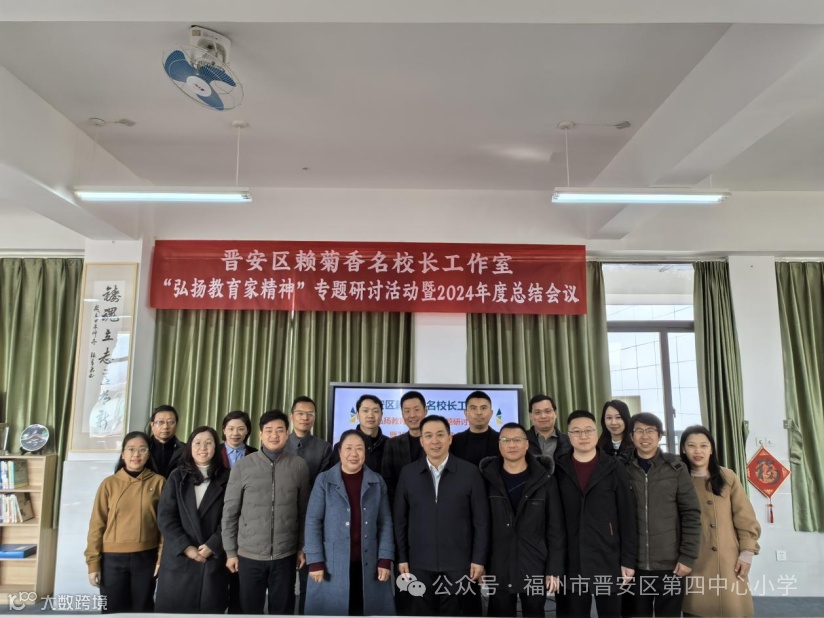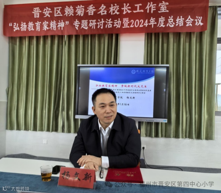 2025年1月16日上午,晋安区赖菊香名校长工作室专题研讨活动暨2024年度总结会议在晋安区第四中心小学三层会议室成功举行。工作室顾问福建教育学院副院长、福建省高校新世纪优秀人才支持人选、教育部中小学校长国家级培训专家、福建省首批基础教育教师培训专家杨文新教授、工作室主持人赖菊香校长及工作室成员齐聚一堂,活动由工作室成员肖山校长主持。