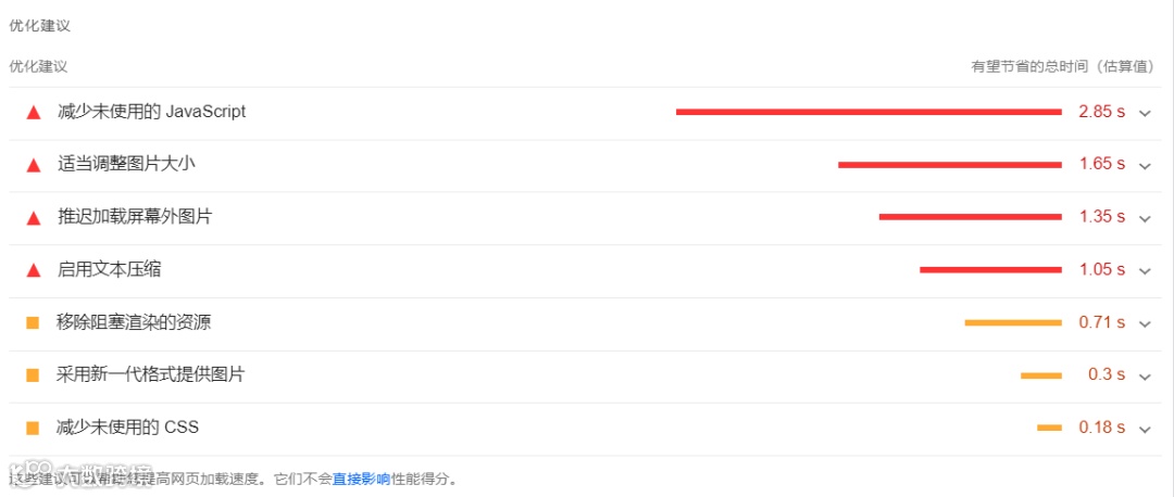 建议可减少未使用的JavaScript、适当调整图片大小、推迟加载屏幕外图片、启用文本压缩等来帮助网站的加载速度。
