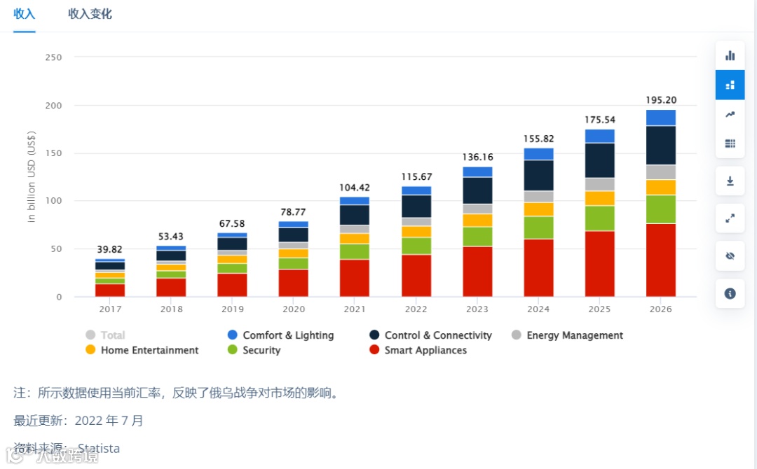 全球智能家居的市场非常广阔,据statista数据显示,预计2022年智能家居市场收入将达到1157亿美元。预计收入年增长率(CAGR2022-2026) 为13.97%,预计到2026年市场规模将达到1952亿美元。