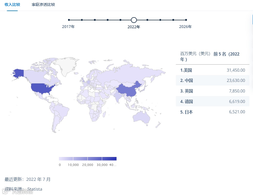 据全球比较显示,大部分收入来自美国(2022年为314.50亿美元),美国地区仍是开发的重点市场之一。