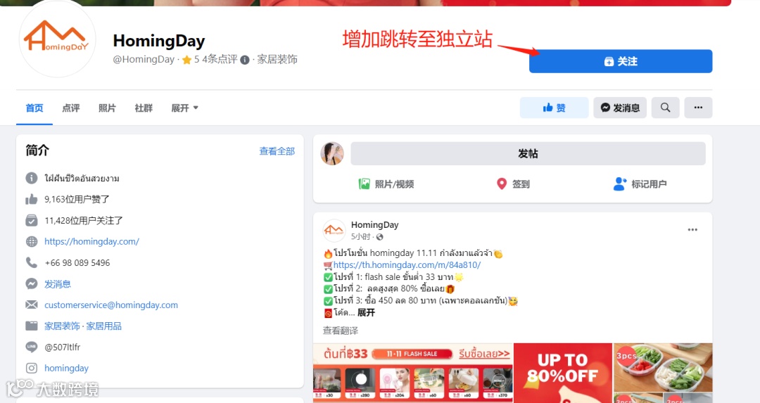 Facebook账号的关注者为1.1万,主页标注了独立站的链接地址,但是缺少直接跳转到网站的设置。
