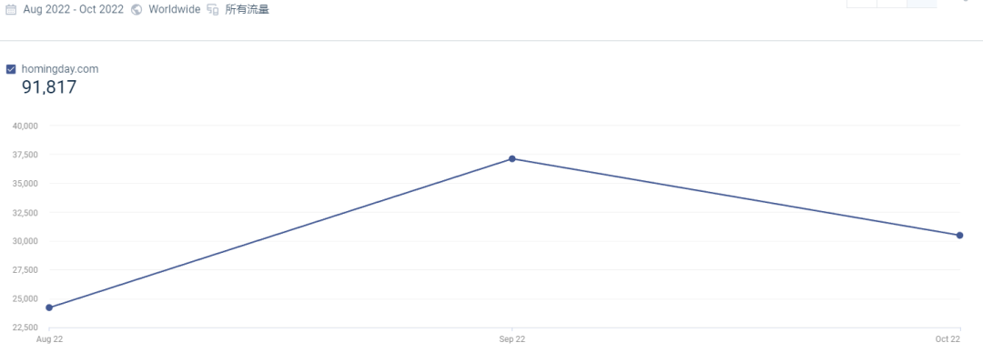 Molly发现其域名homingday.com于2022年4月10日创建,经由Godaddy注册,网站的正式上线时间大概是6-7月,彼时才开始有流量引入。