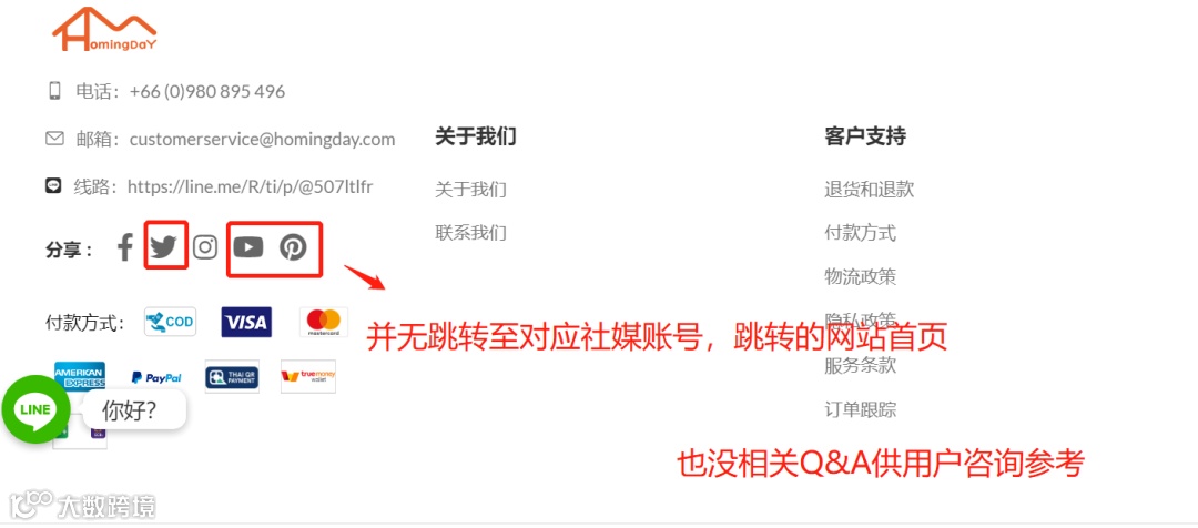 在Molly看来,目前网站的搭建算是一个正常可使用的网站,但如果从品牌精细化运营的角度来说,仍有改进空间,例如品牌的理念、品牌故事在网站上并不能很强烈的展示出来,包括联盟广告、红人的社媒post、Q&A等板块并未设置,并且点击网站底部的Twitter、YouTube及Pinterest并没有跳转至对应的社媒账号,跳转的是网站首页,类似这样的细节也是卖家需要关注的地方。