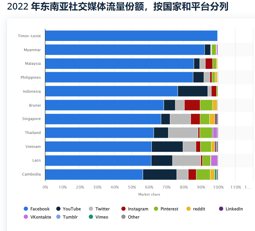 据statista显示,在东南亚Facebook的渗透率已经达到了99.56%,是2022年所有东南亚国家最受欢迎的社交媒体平台,其次YouTube、Twitter、Instagram和Pinterest也是其中占有重要份额的平台。