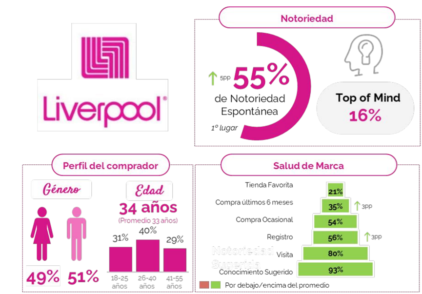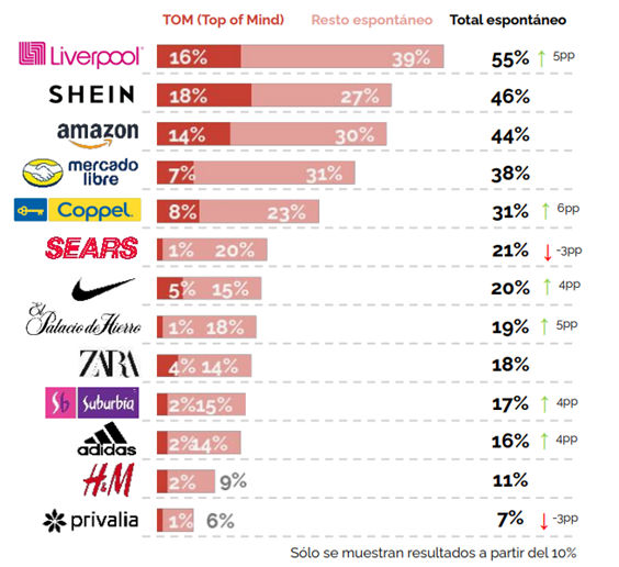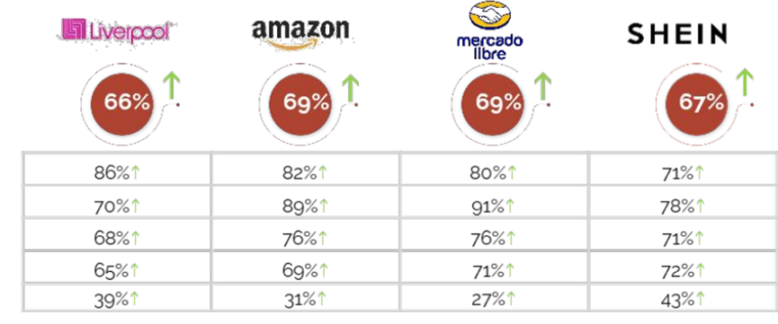 调查结果显示,在墨西哥Liverpool以55%的自发提及率占据榜首;Shein以46%的自发提及率紧随其后;亚马逊以44%位居第三;美客多(38%)和Coppel(31%)分别排名第4和第五。
