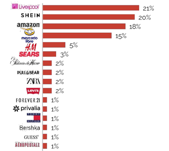 在最受墨西哥人喜爱的在在线时尚商店调查中,四家头部品牌分别为:Liverpool(21%)排名第一;Shein(20%)排名第二;亚马逊(18%)排名第三;美客多(15%)排名第四。排名在第五、六、七位的H&M、SEARS和ZARA仅占5%、3%、2%,与前四名已经断层。
