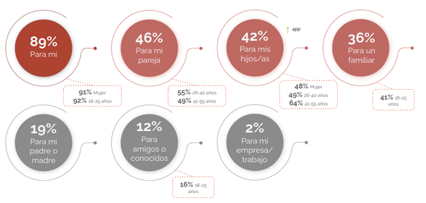 在购买用途上,89%是为自己使用为目的而消费;46%的人会为自己的伴侣购买;42%的人为儿女购买;36%会为亲戚购买(传统墨西哥家族庞大且联系紧密);19%为父母购买;12%为朋友或熟人;2%为工作或公司。