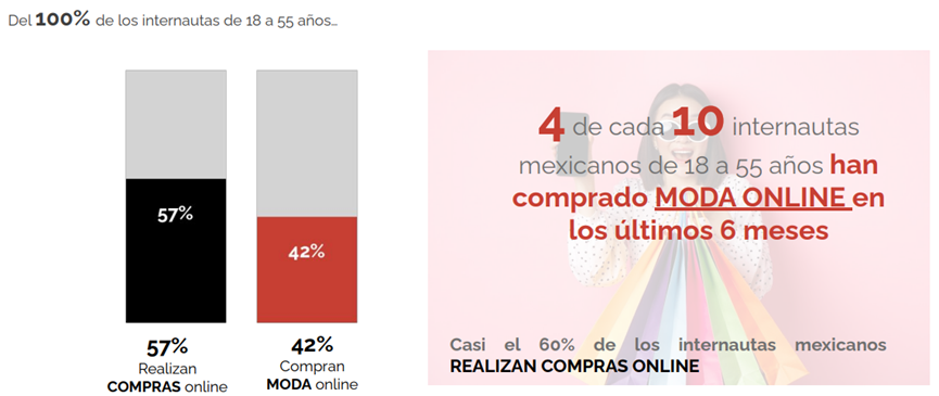 该调查的研究对象是来自墨西哥18-55岁互联网用户,结果显示:在过去的6个月内,有57%的互联网用户进行过线上购物,有42%的互联网用户在线上购买过时尚类商品。