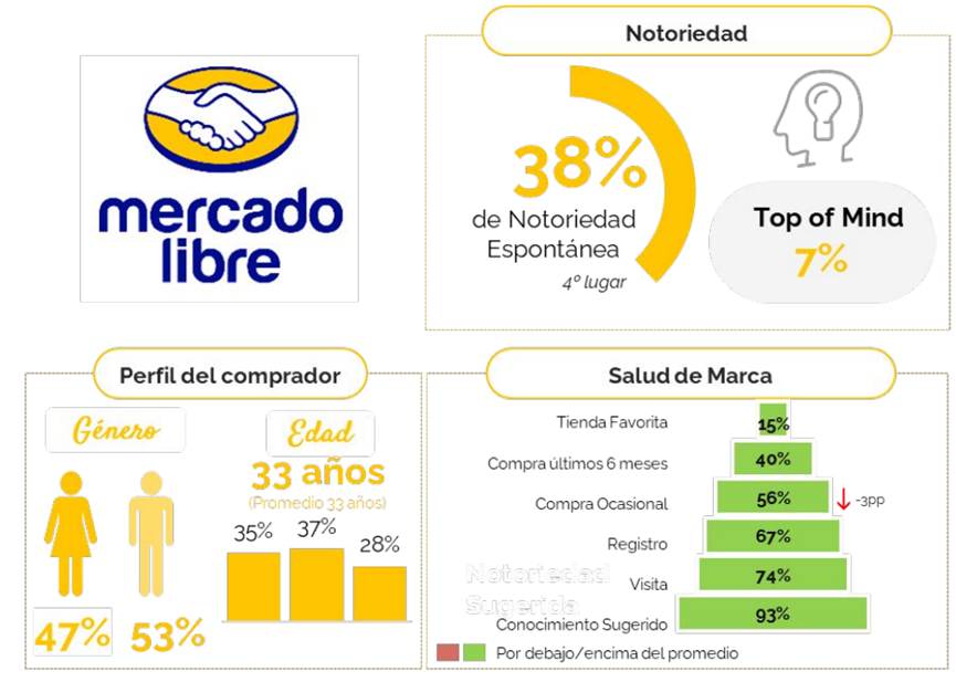 Mercado Libre美客多的女性用户占比47%,男性用户53%,用户平均年龄33岁,其中18-25岁占35%,26-40岁的用户占37%,41-55岁占28%(未统计其它年龄段)。知名度指数38%,排名第四,第一自发提及度为7%。品牌健康指数:15%的墨西哥人最偏好的品牌,40%的人在过去的6个月有过购买,56%的人偶尔购买,67%的人进行了注册,74%的人访问过其网站,93%的人推荐。