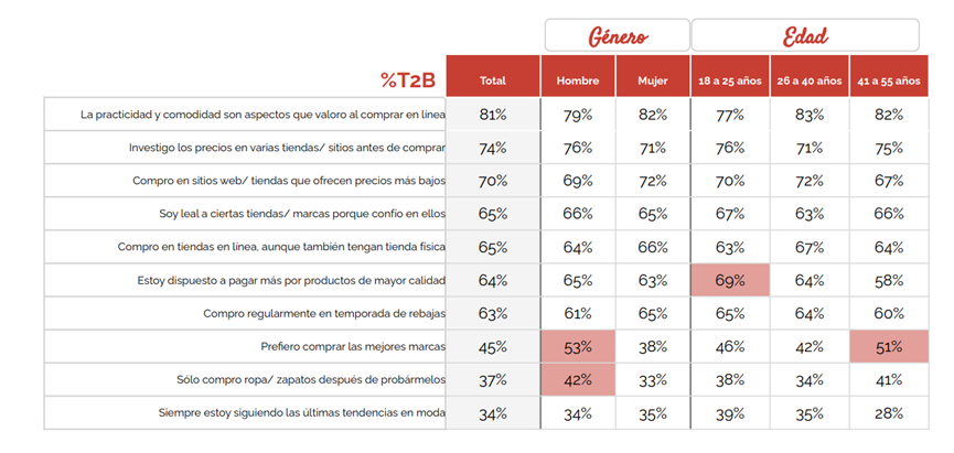 有81%的墨西哥消费者表示,在网购时尚类商品时最看重的是产品的实用性和舒适度;其次,74%的消费者会在购买前在多家商店、渠道对价格进行调查和对比;70%的消费者会在提供最大优惠、最好价格的平台、商店进行下单;有65%的用户在购物时对特定品牌有偏好,对其有忠诚度;65%的消费者更偏好线上下单,即使该品牌有实体店;64%的消费者愿意为更高质量的产品支付溢价;63%的消费者会经常性的参与销售大促;45%的消费者偏好来自更好品牌的商品;有37%的消费者表示只有在试穿后才会下单;而追随潮流的消费者则有34%。