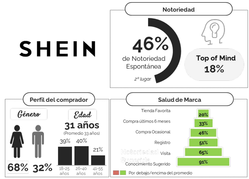 Shein的女性用户占比68%,男性用户32%,用户平均年龄31岁,其中18-25岁占39%,26-40岁的用户占40%,41-55岁占21%(未统计其它年龄段),是性别、年龄差异最大的品牌。知名度指数46%,排名第二,第一自发提及度为18%。品牌健康指数:20%的墨西哥人最偏好的品牌,33%的人在过去的6个月有过购买,46%的人偶尔购买,51%的人进行了注册,65%的人访问过其网站,91%的人推荐。