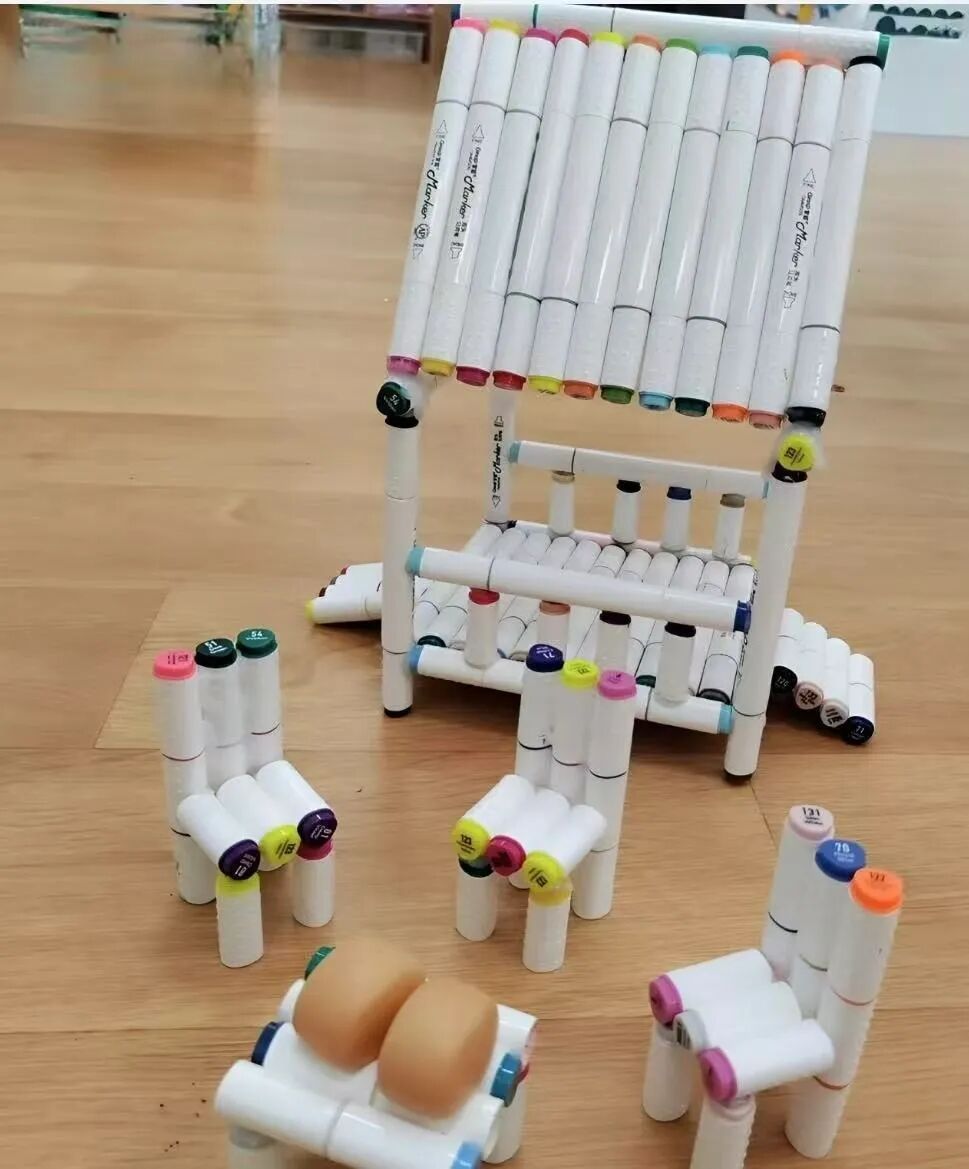马克笔可以叠高楼吗?他们一起讨论、探究“如何把地基固牢”,“如何慢慢地把每层摆放整齐”,一次次的尝试调整之后,楼房越搭越高,并且相对稳定。