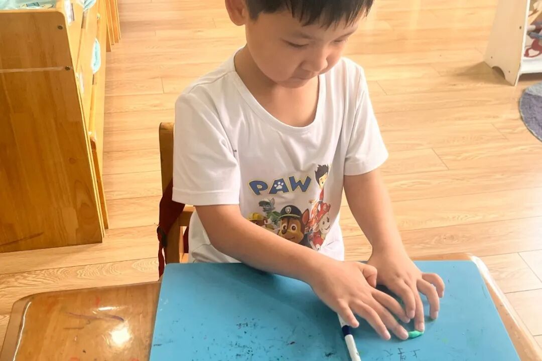 老师的话:根据《指南》,大班幼儿在对话中通过“画箭头”“用彩泥固定名字”等方式解决“辨认椅子”的问题,既体现了用图画、符号记录的科学探究能力,也展现了分工合作的社会性发展,同时在装饰名字的过程中锻炼了前书写技能与艺术表达能力。