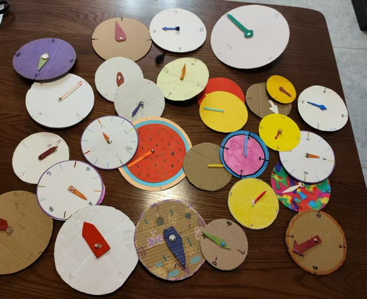 针对小学生以具象思维为主、注意力易分散的认知特点,教师在课前进行了精细化教具准备。一是,实物教具:学生自己动手制作的转盘(如图),学生可通过手指拨动指针观察旋转轨迹;