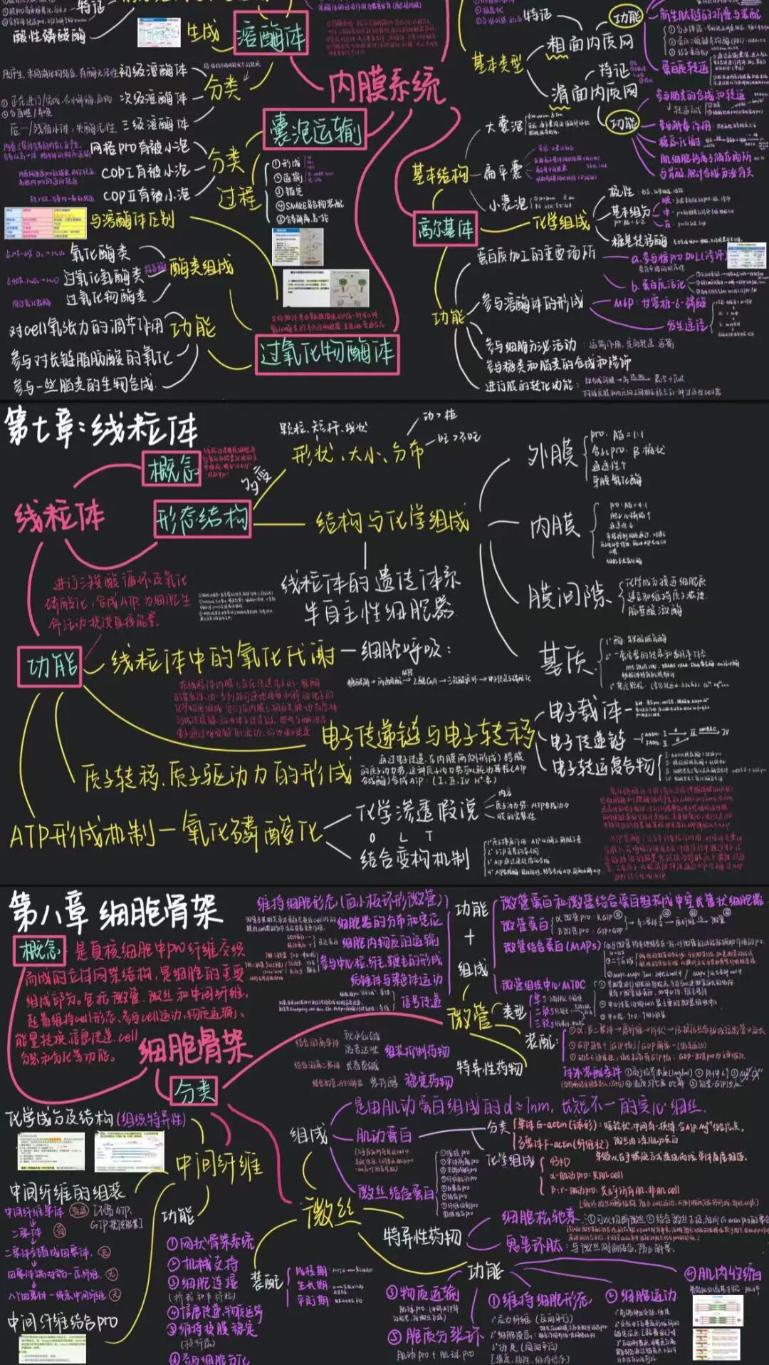 我是2023级阳明创新2班临床医学专业的高康阳。在学习医学细胞学时,我以思维导图为核心,将庞杂的知识系统化。我的笔记通常从构建知识框架开始,先用树状结构梳理章节逻辑,区分核心概念与衍生内容,再通过多色标注不同知识类型,如机制、结构和临床意义,并辅以符号系统标记重点,极大提高我的复习效率。