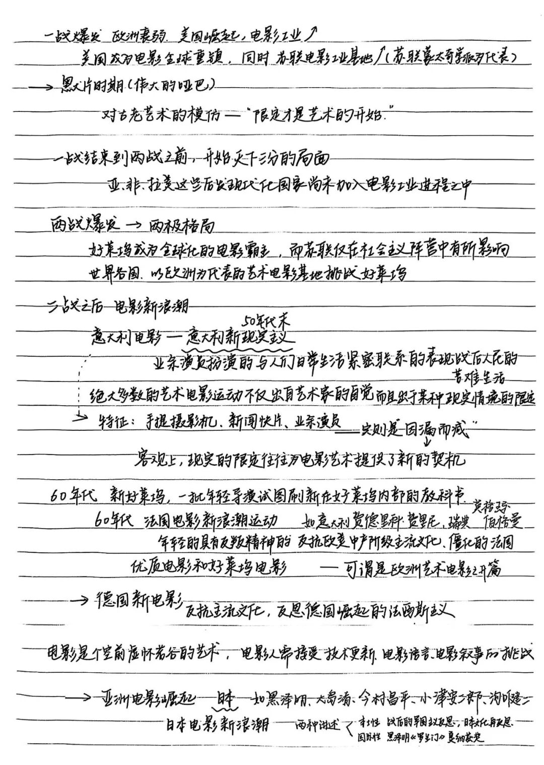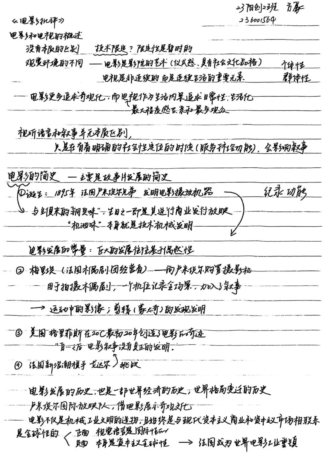 我是2023阳明创新2班汉语言文学专业的方豪。这是我根据网上课程整理记录的电影学笔记,从上至下为电影批评,电影赏析,案例分析,新现象和新选题。我的笔记注重知识的系统性和逻辑性,采用从理论到应用到扩展,将复杂的内容条理化、可视化。我在笔记中穿插经典案例和图示,帮助自己更好地理解和记忆。同时,我也会用不同颜色的笔标注重点和难点,让笔记更加清晰易懂。