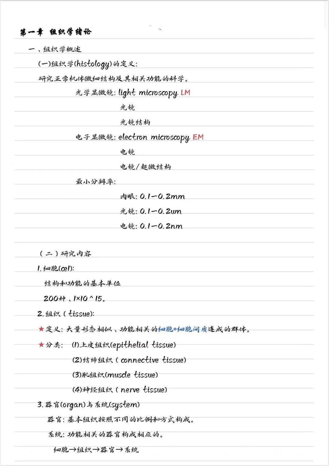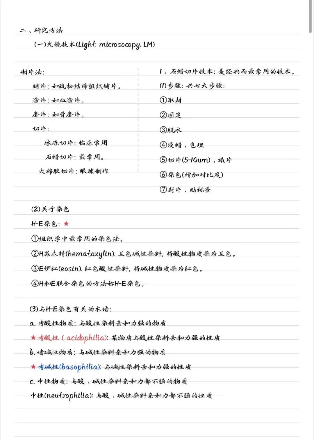 3. 术语强化:用★标记核心概念(如“嗜酸性”“基膜”),辅以箭头符号(→)体现逻辑关联,帮助记忆复杂流程(如电镜制片步骤)。 我希望能通过清晰的逻辑与视觉化呈现,让笔记成为高效复习的工具。