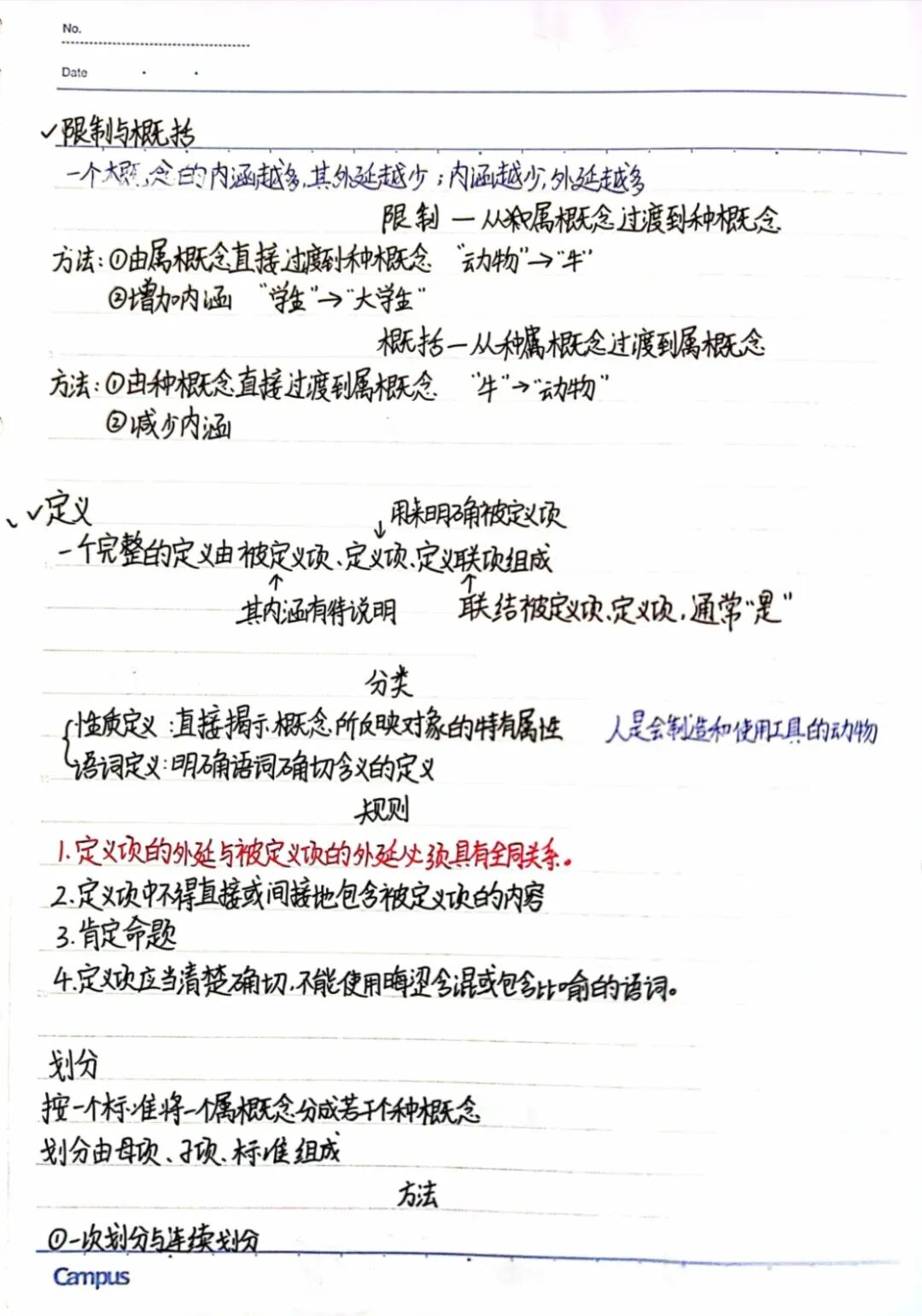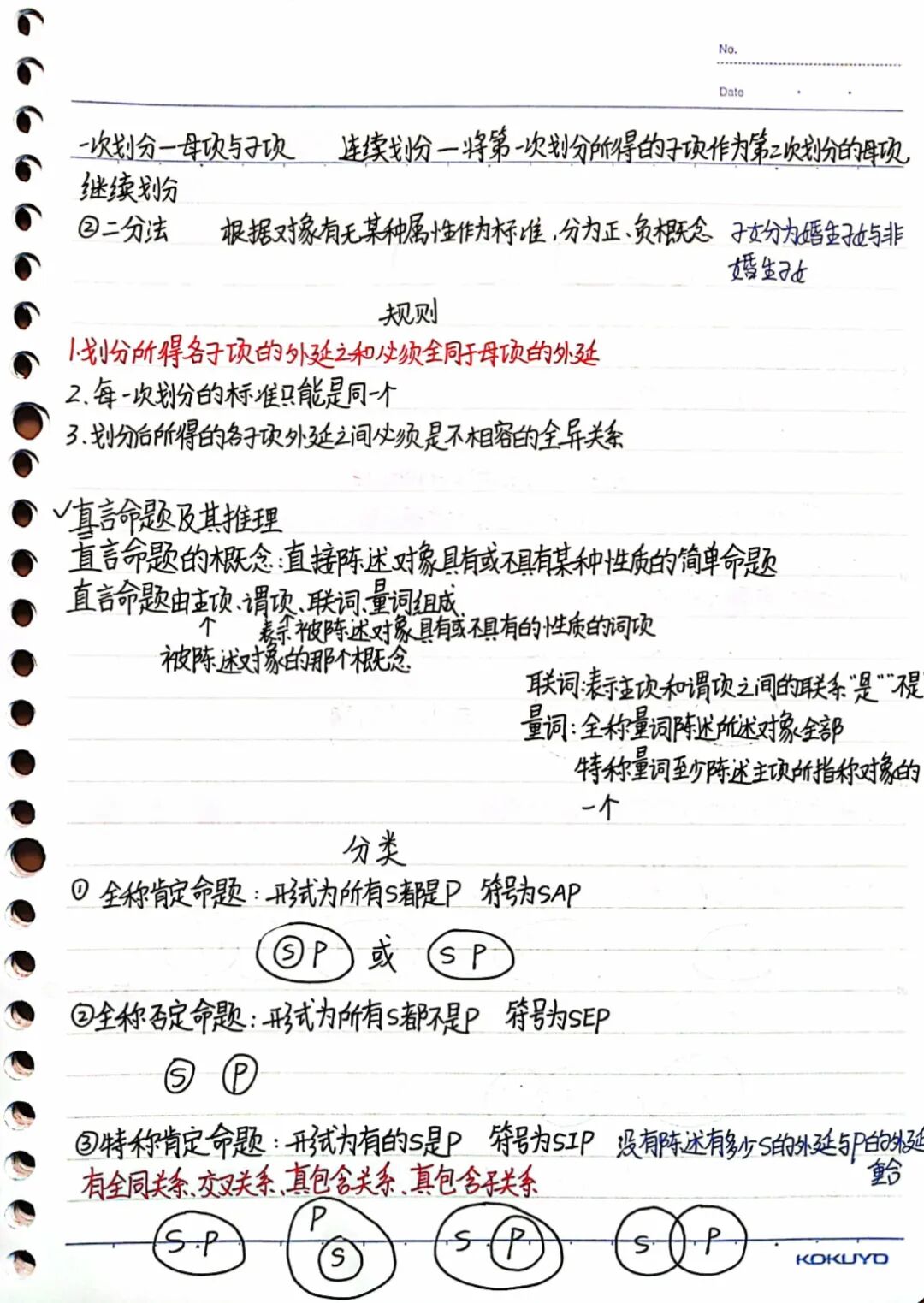 我是2022级阳明创新1班思政教育师范专业的王佳,专业学习勤奋认真,专业成绩名列前茅。此笔记为逻辑学课程笔记,逻辑学是一门强调抽象推理归纳的课程。虽然理论较为晦涩,但我通过笔记辨析其中的重要概念、自行推导重要公式、在实例中运用总结,可以较好地掌握课程知识,而且学习逻辑学能帮助我们更加严谨细致地对待生活。