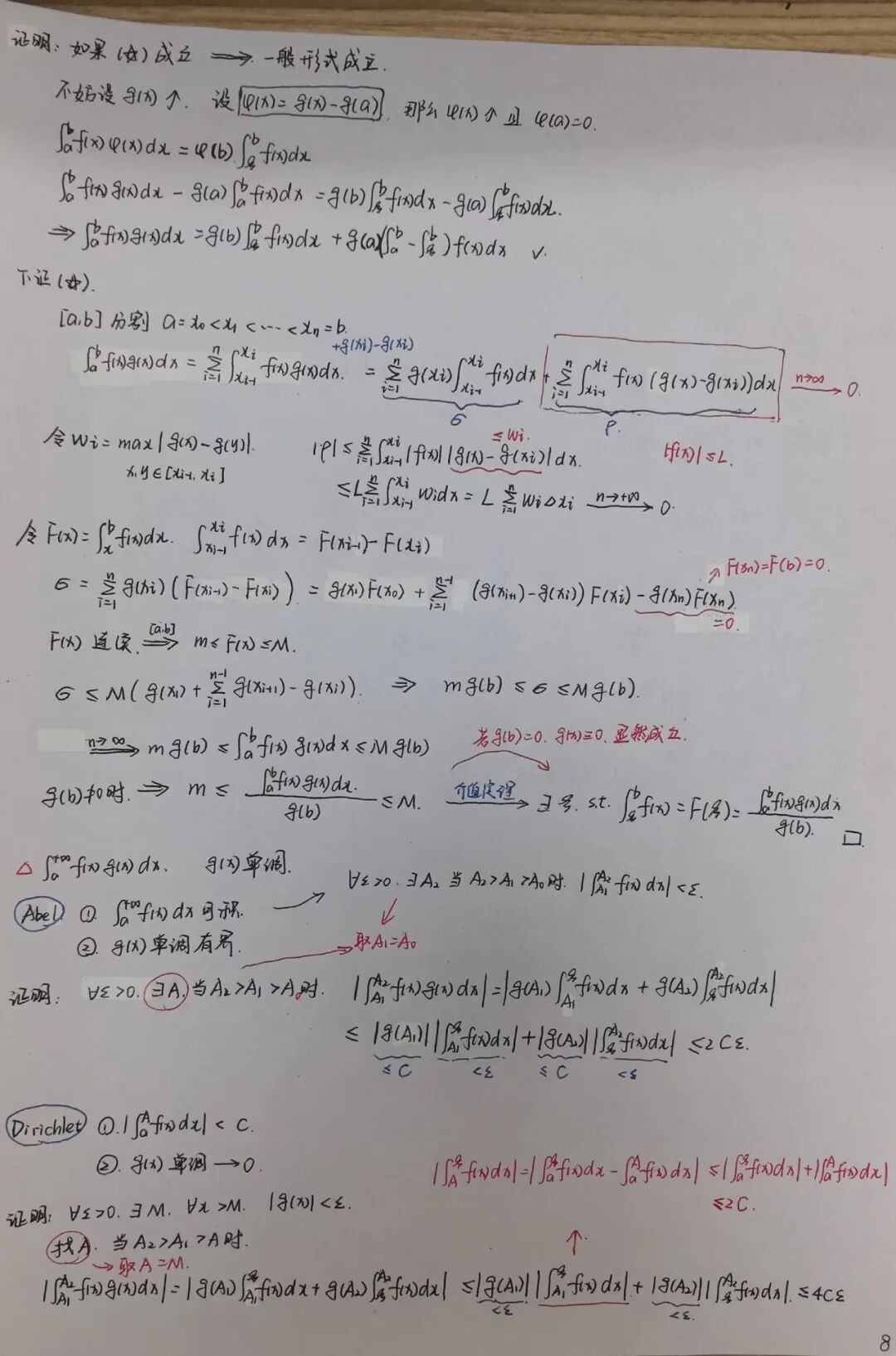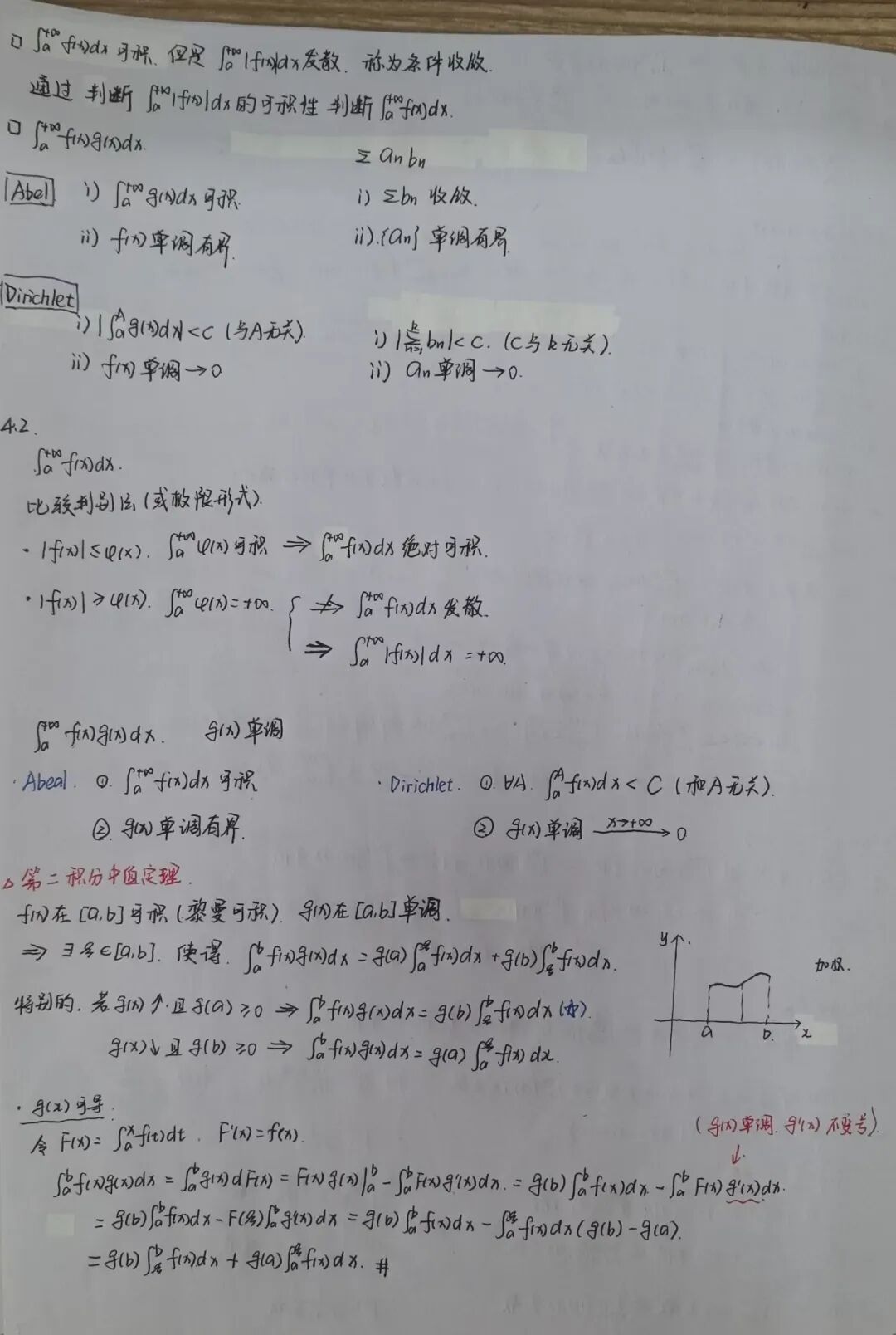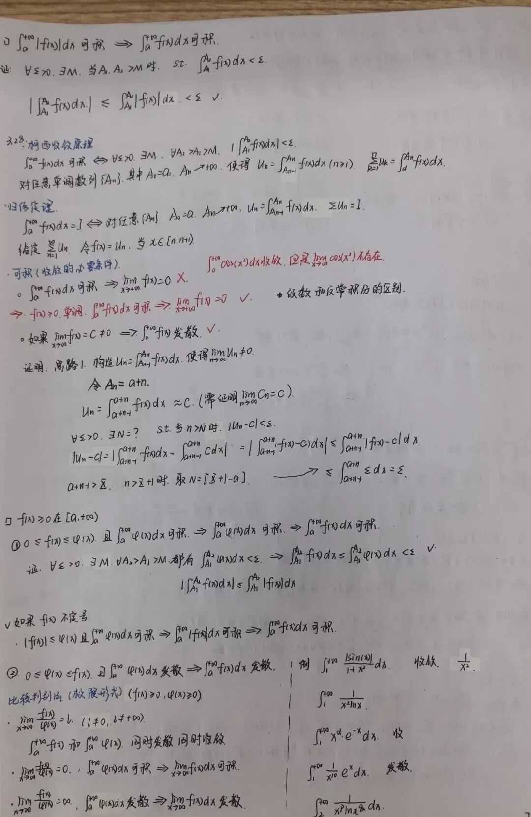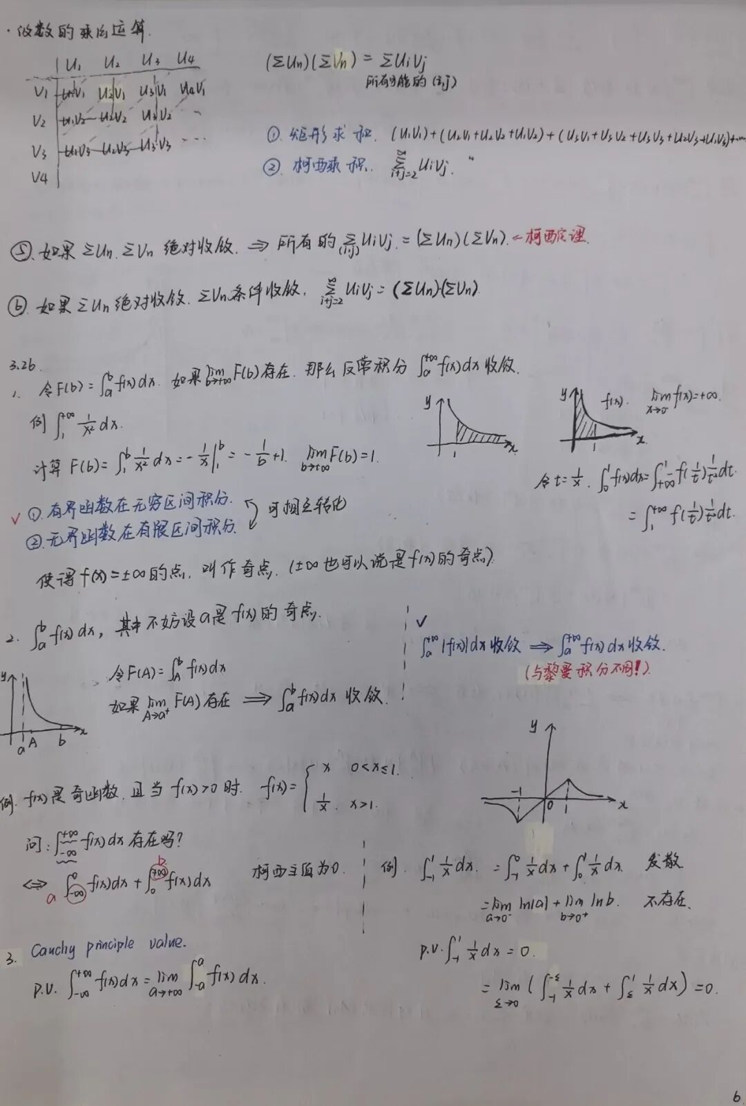 我是2024级阳明创新班数学与应用数学专业的方韵怡。这些笔记主要是数学分析中级数收敛和反常积分的部分。笔记遵循 “先分后合” 逻辑,既按 “级数收敛性判定 — 函数项级数性质 — 反常积分计算与判别” 模块化梳理,又通过跨章节关联线(如级数与积分在 Cauchy 准则下的统一性)构建知识网络,辅以不同颜色的笔标注核心公式(如积分中值定理在反常积分收敛性证明中的应用),力求在严谨推导中凸显直观理解,助力突破 “抽象概念具象化” 的学习瓶颈,践行阳明学子 “格物致知” 的治学态度。