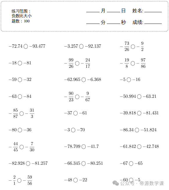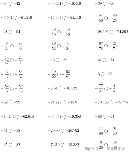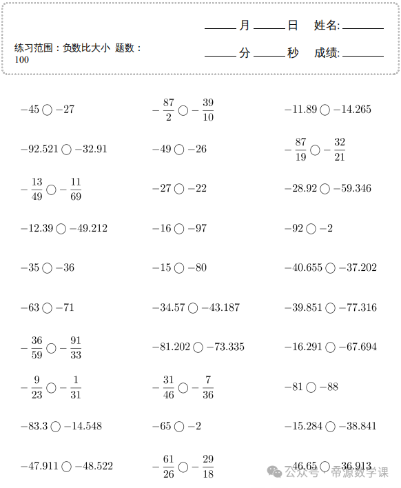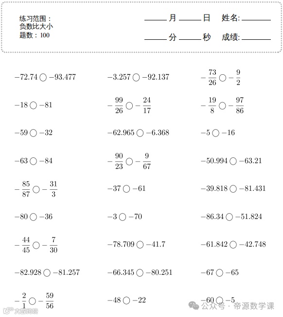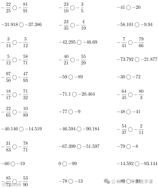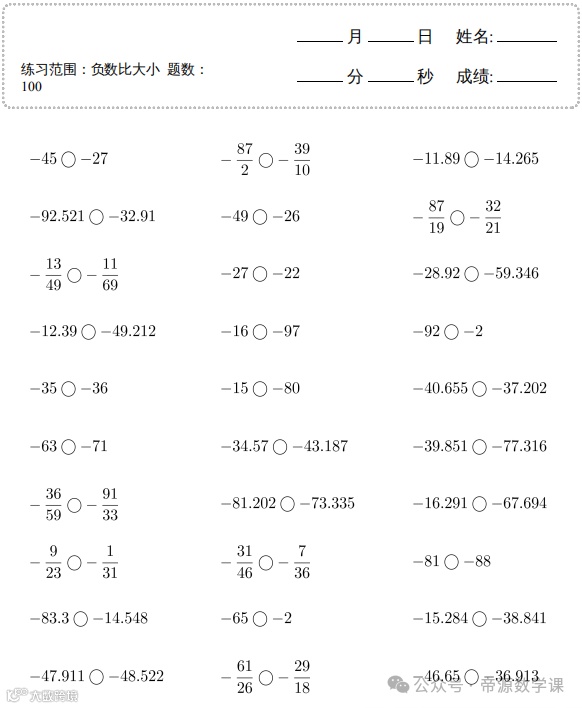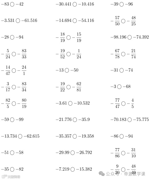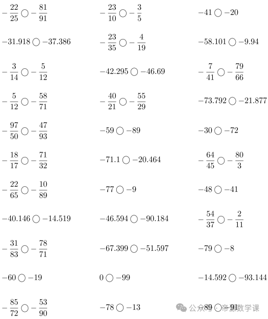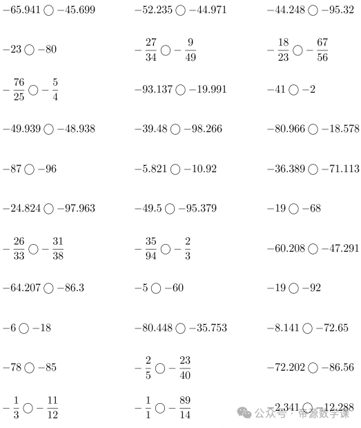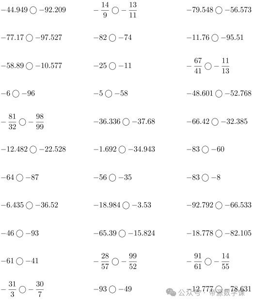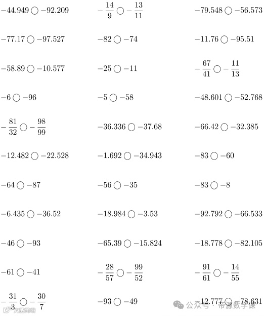 老师整理了小学六年级数学下册(负数比大小)口算题,可打印练习!