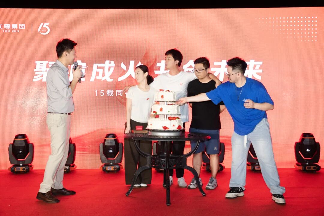 表彰仪式后,点缀着 “15 周年” 字样的十五周年纪念蛋糕被缓缓推至现场,总经理与两位十周年员工稳稳切下象征 “过往辉煌与未来期许” 的蛋糕。祈愿优尊集团未来蒸蒸日上,再创佳绩。