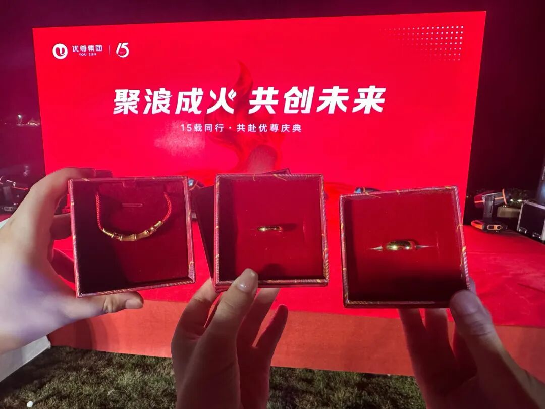 晚餐过后,“优尊集团周年感恩表彰仪式” 正式举行。此次表彰旨在致敬长期以来为优尊发展付出心血的员工,每位入职5周年以上的优尊人都将颁发一枚刻有自己名字和入职年份的黄金戒指,戒指凝聚了力量,同时也充满了感谢和温暖。