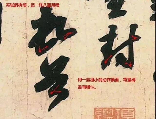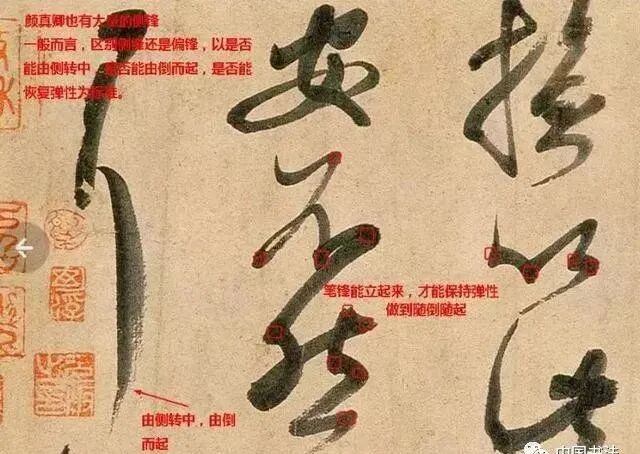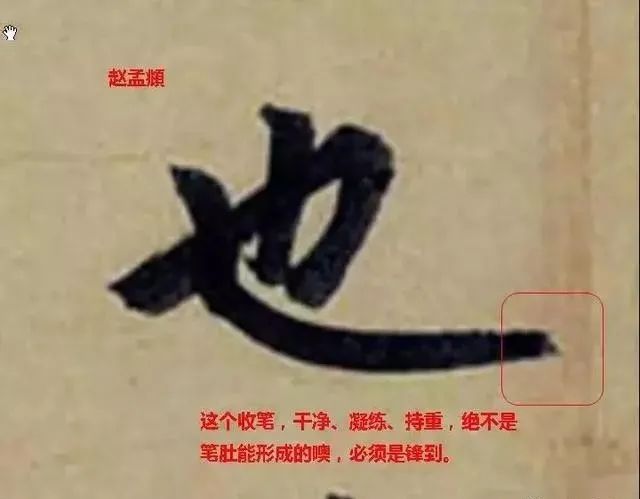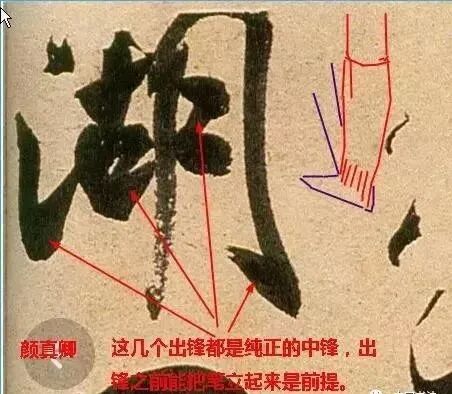 理论上所说的笔锋的顶端,实际运用上,锋指的是锋端及笔毫近的那一段,再远些就是笔腰,笔腰是笔毫产生弹性的部位,也有不少书家惯用笔腰,如颜真卿等,“力点”常不在锋而在笔腰,腰一触纸即能弹走,所以顿重而能清劲。可惜很多学他的人,一顿即倒腰软无力,外形相似而神情大异。近代康有为,笔腹腰也运用得很精彩。