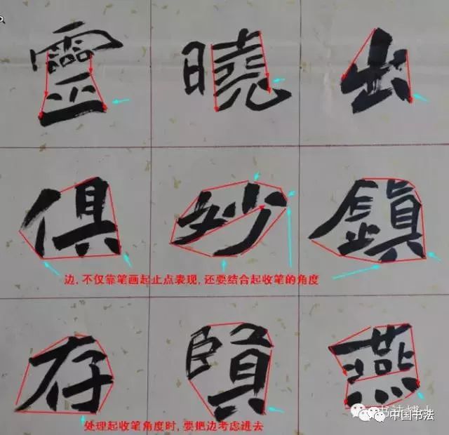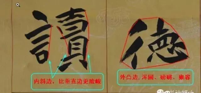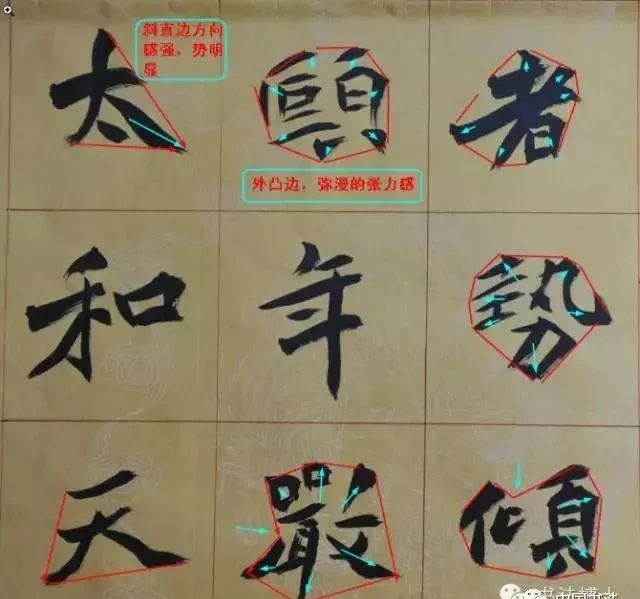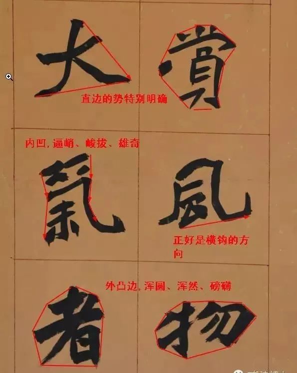 弧边,有外凸和内凹两种。外凸,如郑文公碑,大量地使用外凸边,力和势上表现出弥漫的张力感,由内而外的张力,字形边缘形成强大的气压带和控制力,这个边形成的气压带具有引力,把笔画吸到指定位置,而笔画到达外接圆即受阻停住,无法冲出气压带,所以,郑文公碑形象浑圆,精神凝穆,气格凛然不可侵犯。外凸边有助于形成浑圆、浑然、磅礴、超迈、雍容的整体风格。