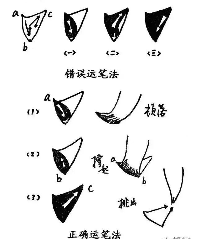 以上运笔熟练之后,只需一按一提即成,不过这提按的刹那之间,暗藏了个挫锋动作,使笔锋能一按提起,由聚而铺,再由铺而聚,这面需要有极其良好的控制笔毫的能力。