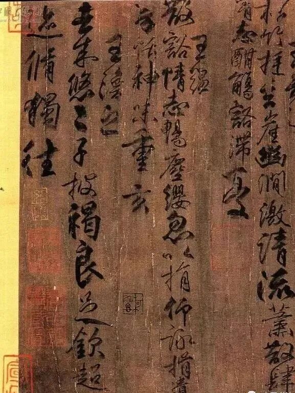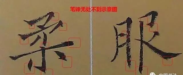 笔毫的末梢——锋,是笔力集中到达,墨水集中流注的地方。善用笔者,能使笔站起来以锋芒运使,这叫“立峰”,笔锋挺而健,有效地传达指腕的力量。在曲张之间“杀”入纸中,获得力透纸背,入木三分的效果,如不能发挥锋的用场,单以笔腹扫顿按,笔画必质感薄弱,墨象虚浮。