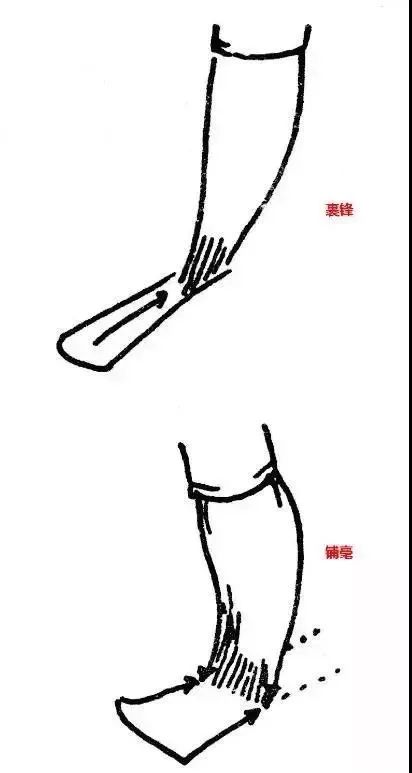 裹锋:运笔时笔管前倾,笔毫被顺拖着走,笔锋自然地向中央收拢,线条中实两边略虚,如刘熙载《书概》中说:“徐弦小篆,画之中心有一镂浓墨正当其中,至于屈折处亦当中,无有侧处,盖得蔡中郎遗法也。”写楷书的长横、篆书、连绵草等细劲而圆的笔画常用这个方法。