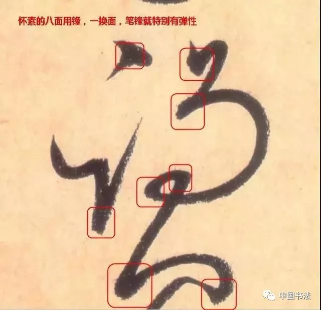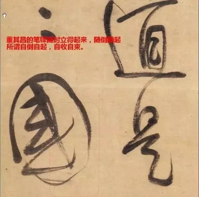 第(3)条笔头状态变化,指运笔中,笔毫锋颖因受力产生的各种变形,如聚、散、扁(方)、圆等,包括笔头触纸方式,是用锋端触纸,还是笔腹着纸;是作势欲弹,还是腰软无力;是整齐铺展,万毫齐力,还是绞纽破败,声嘶力竭。