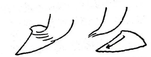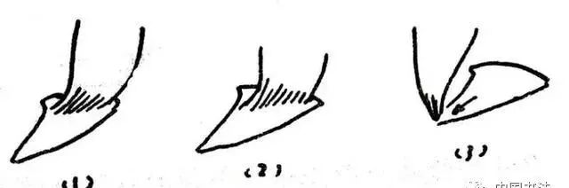 如图撇。开始撇出时,虽然笔锋仍偏,但着纸的笔腰很得力,铮铮欲反弹起,能杀入纸中,整个撇出的过程,笔锋是回顶起来的由倒而立,由侧转中,因此,力感仍然很强。侧锋被认为是成功的可取的。