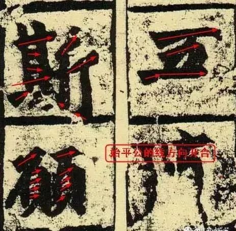 铺毫:运笔时管是稍后倾的,笔毫被推着前进,因而被整齐地打开,呈万毫齐力状态行进,线条两边轮廓线特别有坚实感。魏碑方笔多为这运笔。
