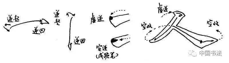 逆锋有时表现为“虚”的形式,如露锋的起笔,要在空中“虚逆”,出锋的收笔,要在笔离纸后在空中回收,虚逆和“空收”均在空中作逆势,是假动作的,不要忽略这个假动作,空中作势形成的沉着质地,意味隽永,是直入直出地运笔无法比拟的,学书者随着功力的加深,自然明白其间玄妙。