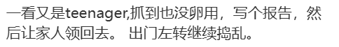 “一看又是teenager,抓到也没卵用,写个报告,家长领回去,出门继续捣乱。”