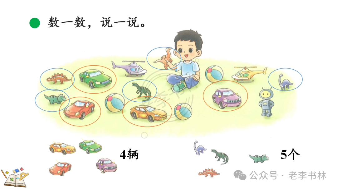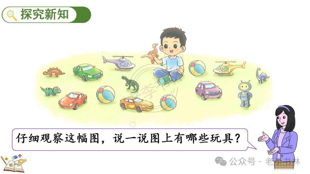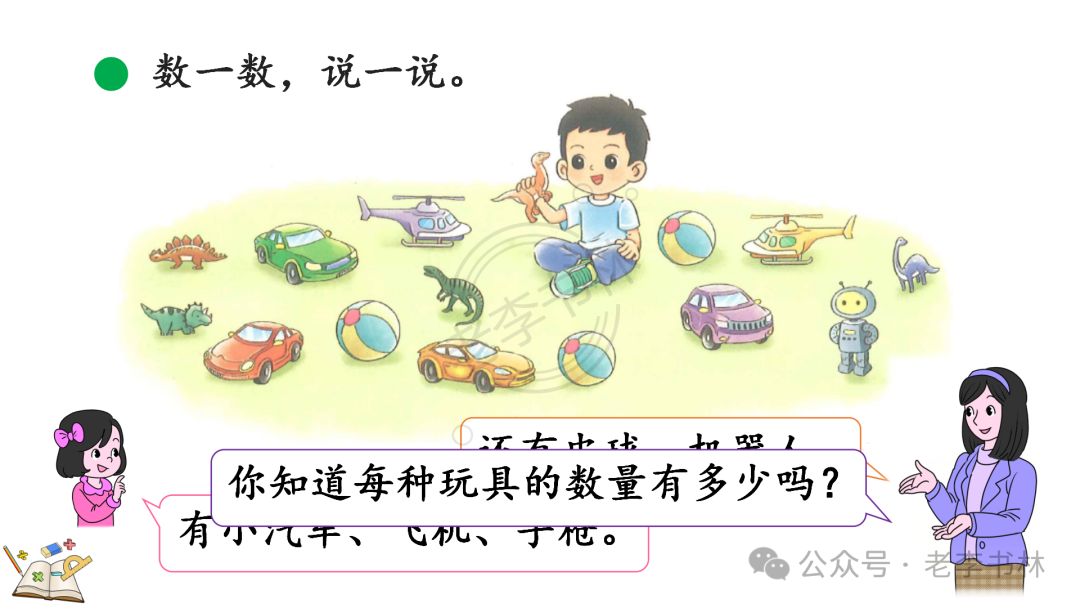 1学生回答:有布娃娃、两个人、皮球、小汽车、积木。2学生回答:1个布娃娃、2个人、3个皮球、4辆车、5块积木。